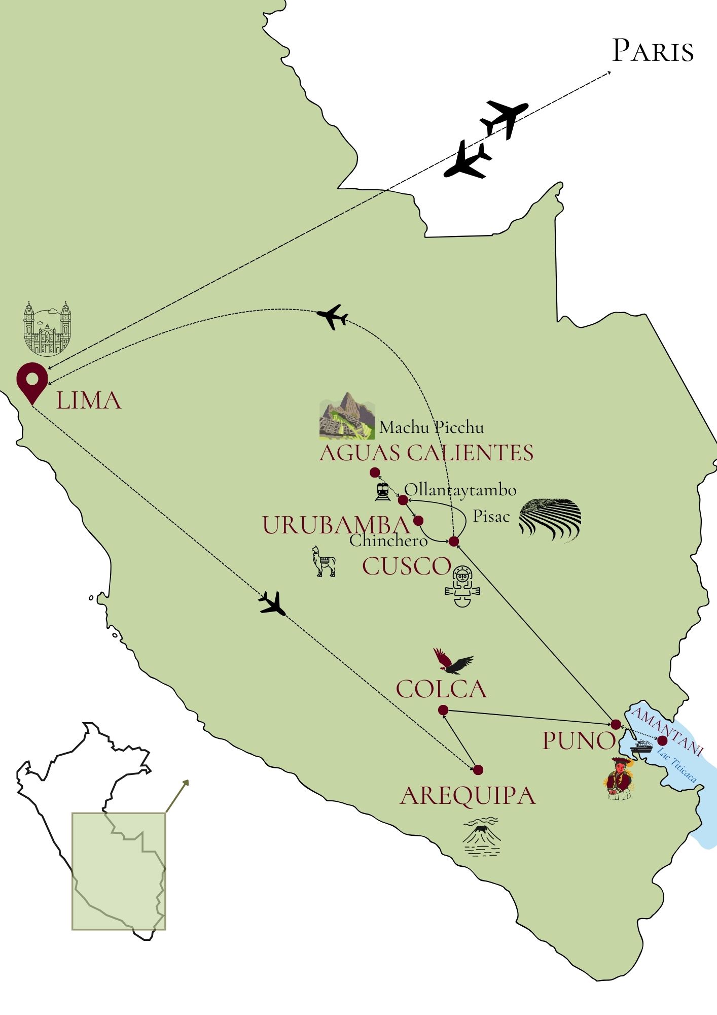 Pour des visites à votre rythme tous nos groupes ne comprendront que 10 participants au maximum pendant les visites Les visites sont effectuées avec nos guides locaux, francophones. Découvrez des incontournables du Pérou notamment la fabuleuse cité inca du Machu Picchu, classé au patrimoine mondial de l'unesco, la vallée sacrée ou encore le Canyon de Colca. Allez à la rencontre des habitants : Le sixième jour, vivez une experience en totale immersion chez une famille vivant sur une ile située sur le lac navigable le plus haut du monde. Le treizième jour, à Chinchero, rencontre avec la famille locale de Jesus de Quillahuaman. Vivez des expériences gustatives typiques : Partage d'un moment convivial, le deuxième jour, autour d'une dégustation du Turron de Doña Pepa, une sucrerie typique. Participation à un atelier création et dégustation du "Pisco Sour", célèbre cocktail péruvien, le troizième jour à Arequipa