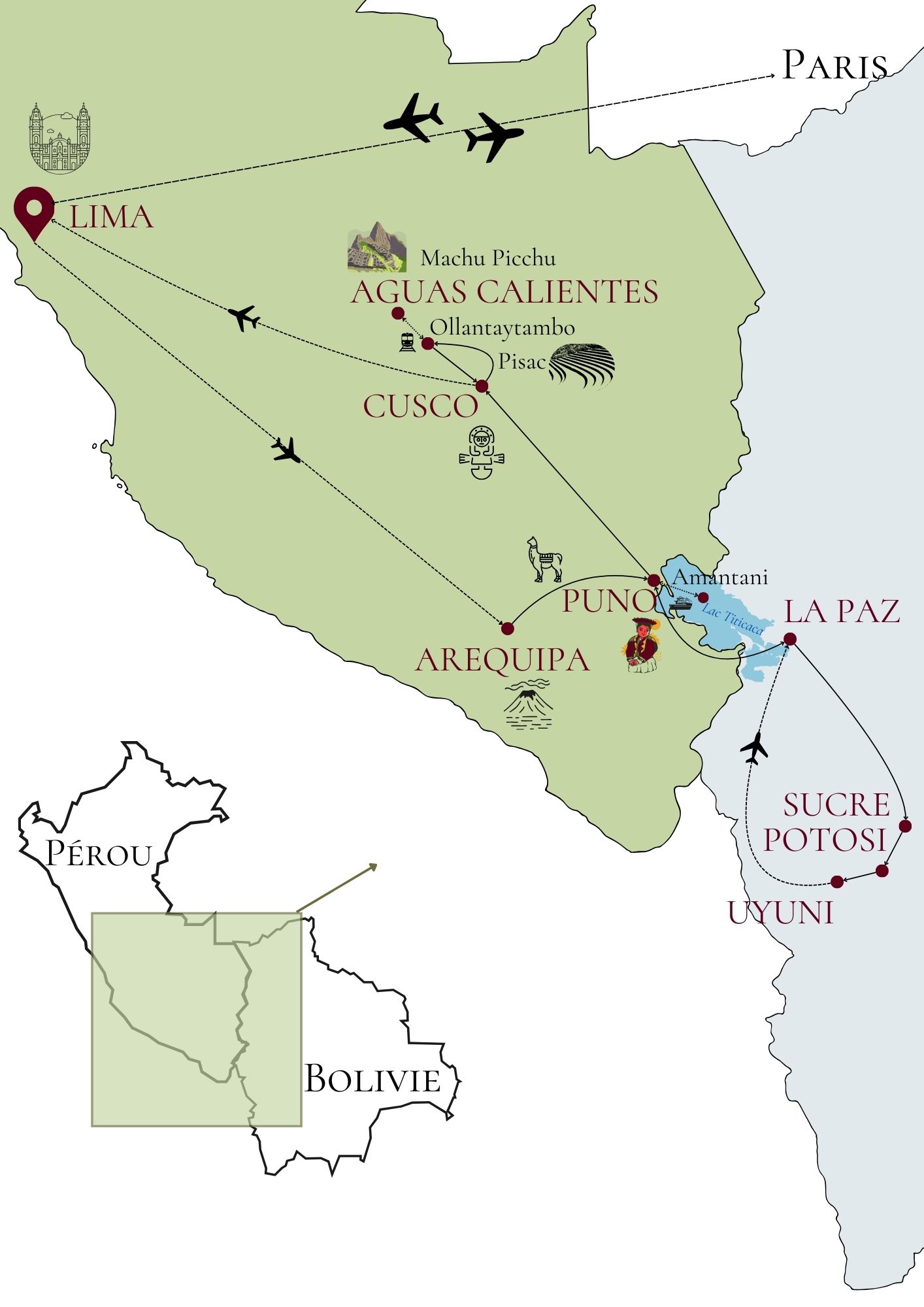 Formalités dentrée (Pérou et Bolivie) : Pas de visa nécessaire pour les séjours de moins de 90 jours / être en possession dun passeport ayant une validité dau moins 6 mois à compter de larrivée sur le territoire péruvien A prévoir dans la valise : Le Pérou ainsi que la Bolivie sont des pays au climat très diversifié, il vous faudra prévoir des tenues pour toutes les saisons, quel que soit votre parcours, car les nuits sont fraîches en altitude, parfois même carrément froides. Mais les températures peuvent également grimpé dans certains endroits. Prévoyez des tenues confort. A prévoir pour les excursions : Chaussures de marche montantes, pansements anti-ampoules (type Compeed), chaussettes épaisses, coupe-vent. Pensez enfin aux protections solaires, essentielles en altitude : crème avec indice de protection élevé (minimum 40), stick à lèvres et lunettes solaires dindice 3 minimum. NB : Pensez à prévoir un sac à dos ou un bagage de type valise cabine lors de l'excursion au Machu Picchu. Mal daltitude : Vous serez certainement amené à séjourner à plus de 2 500 m durant votre séjour. Nous faisons attention à vous permettre une acclimatation progressive à laltitude, afin de limiter les effets de celle-ci (maux de tête, fatigue, troubles du sommeil, essoufflements, troubles digestifs, troubles de léquilibre, perte dappétit, nausées, irritabilité...). Ces symptômes, fréquents et normaux, disparaissent généralement deux-mêmes (ou du moins satténuent grandement) après plusieurs heures en altitude et en ayant recours à des antalgiques (aspirine ou paracétamol). Sentraîner physiquement avant un séjour en altitude nélimine pas les effets du mal de laltitude mais est évidemment recommandé : la pratique du vélo, de la natation ou de la randonnée (si possible en altitude) constitueront une bonne préparation. Il est important de consulter votre médecin traitant pour quil détecte déventuelles carences ou affections avant votre départ (problème respiratoire, cardiaque, etc). Pour atténuer les effets et limiter les risques daggravation, deux règles dor sont à respecter : commencer doucement et monter progressivement. Voici quelques conseils pour votre séjour : dans les premières 24h : économiser ses forces, marcher lentement et avoir une bonne ventilation ensuite toujours bien shydrater en évitant lalcool et bien salimenter. Votre sécurité étant notre priorité, tous nos guides et accompagnateurs sont formés à diagnostiquer les œdèmes (et autres formes graves) quand ils surviennent et à réagir de la façon la plus appropriée. Nous menons des formations de secours et premiers soins à tous nos guides. Niveaux d'altitude : Arequipa : 2335 m Canyon de Colca : 4 350 m Puno / Lac Titicaca : 3827 m La Paz : 3650 m Coroico : 1525 m Sucre : 2750 m Potosi : 4090 m Uyuni : 3 500 m Cuzco : 3399 m Vallée Sacrée : 2 800 m Machu Picchu : 2430 m Dengue : La transmission de la dengue seffectue par lintermédiaire de moustiques infectés. Les pluies et les chaleurs de lété austral (décembre à avril) favorisent la multiplication des moustiques transmetteurs de ce virus. De ce fait, une épidémie de dengue se déclare chaque année à cette période, notamment dans le nord et louest du Pérou. Il convient de se protéger en cas de déplacement dans les régions du nord et de louest du pays, de ne pas rester près de points deau stagnante et dutiliser des moustiquaires et des produits anti-moustiques. Il exite également un vaccin contre la dengue. Vaccins : Aucun vaccin nest obligatoire pour voyager au Pérou ou en Bolivie. Nous vous conseillons dêtre à jour dans les vaccins « types » du voyageur comme la DT Polio ou lHépatite A.