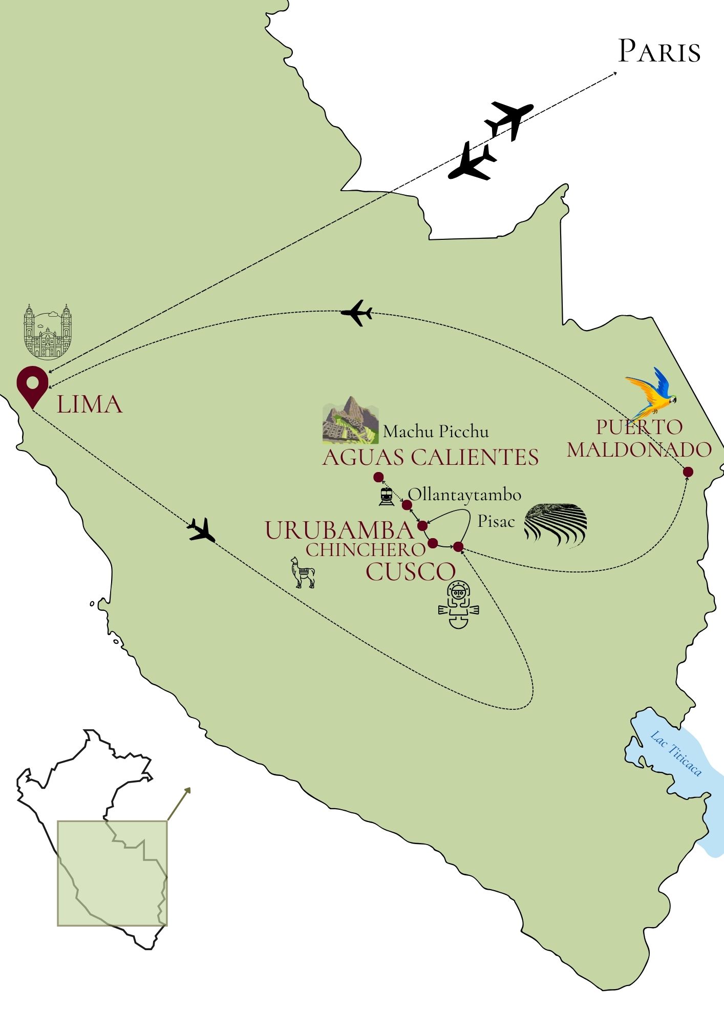 Les vols internationnaux avec la compagnie Air France Les vols intérieurs Lima Cusco le jour 2, Cusco / Puerto Maldonado le jour 9 et Puerto Maldonado / Lima le jour 12 avec la compagnie LATAM. Tous les transferts vers et depuis les aéroports. Les transports en autocar partagés lors des visites. Le train de Ollantaytambo à Aguas calientes A/R avec la compagnie Perurail les jour 6(aller) et 7(retour). Lhébergement en hôtels 3* en chambre double excepté le jour 8 Une nuit chez lhabitant le jour 8. La pension complète du diner du jour 1 jusquau petit déjeuner du dernier jour excepté le déjeuner du jour 4. Un déjeuner avec la communauté Huilloc le jour 6. Les taxes de séjours. Les visites, entrées et excursions mentionnées dans le programme. Les visites guidées en français. Un guide local francophone dans chaque région.