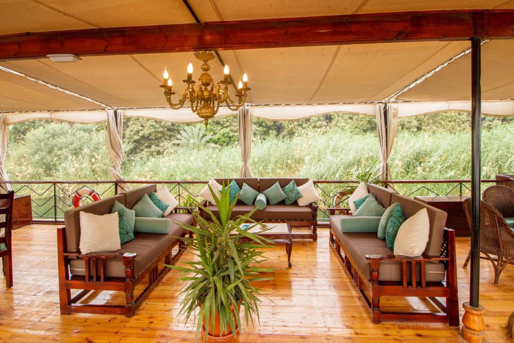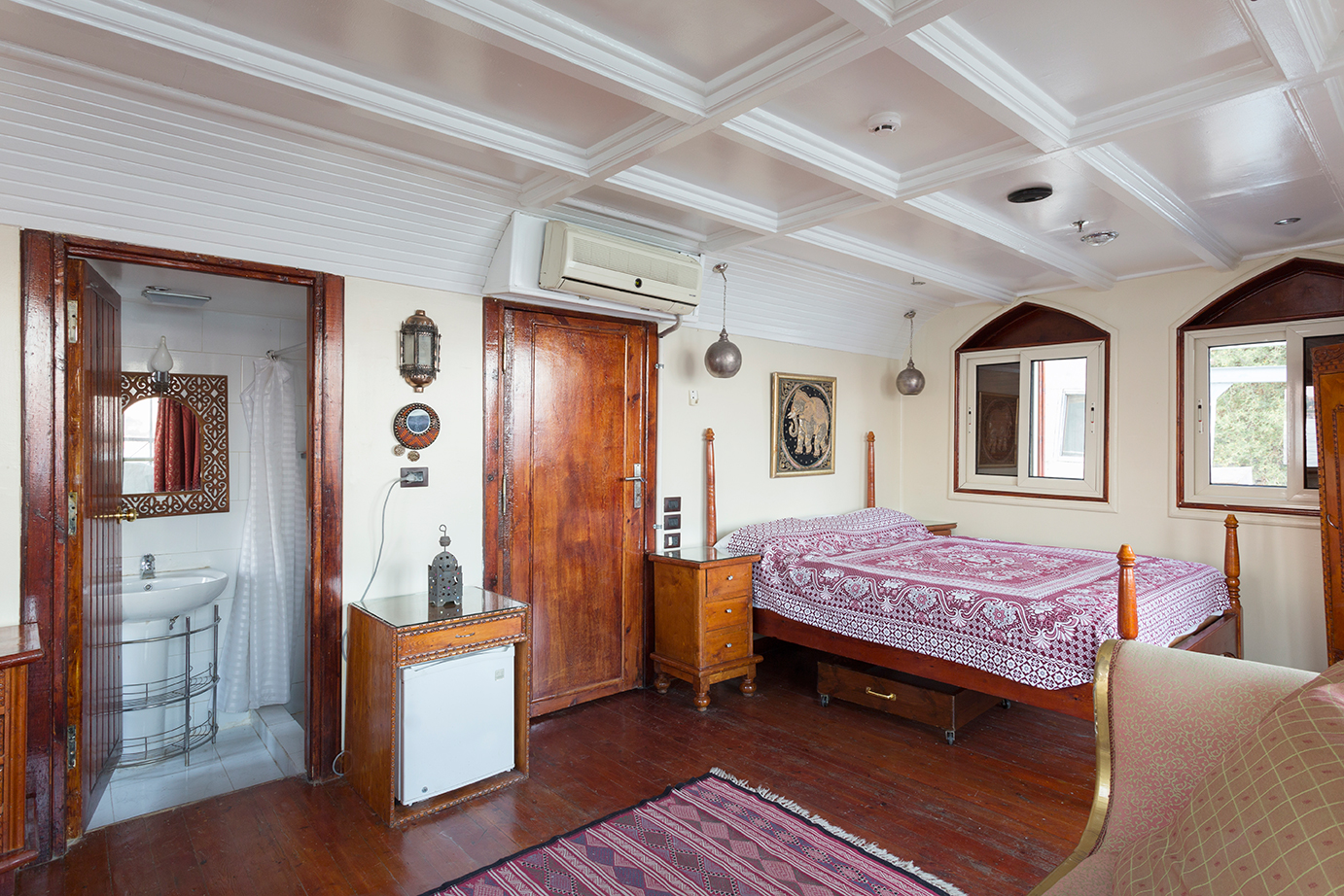 VOTRE BATEAU La Queen Tiy est un voilier traditionnel égyptien composé de 4 cabines et 1 Suite avec terrasse privée pour une capacité totale de 5 cabines. Des spécialités égyptiennes sont préparées à bord par le chef et servis sur le pont supérieur ou dans la salle à manger sur le pont principal, ainsi que des salons et transats en extérieur pour profiter de la beauté des rives du Nil. Inclus dans le forfait, la formule « tout inclus » à bord avec boissons, eau minérale, thé, café, boisson gazeuse et fruits frais servis toute la journée. De plus la Queen Tyi propose un accès gratuit et illimité au wifi 24/24. Les cabines de 10m² disposent chacune dune salle de bain privée ainsi que la climatisation individuelle et deux fenêtres offrant une vue sur les rives du Nil. La Suite de 36m² se situe à larrière du bateau et dispose dune terrasse privée faisant la largeur du voilier. La suite offre une vue imprenable durant les temps de navigation. Elle dispose de la climatisation individuelle ainsi sa propre salle de bain et dun espace salon.