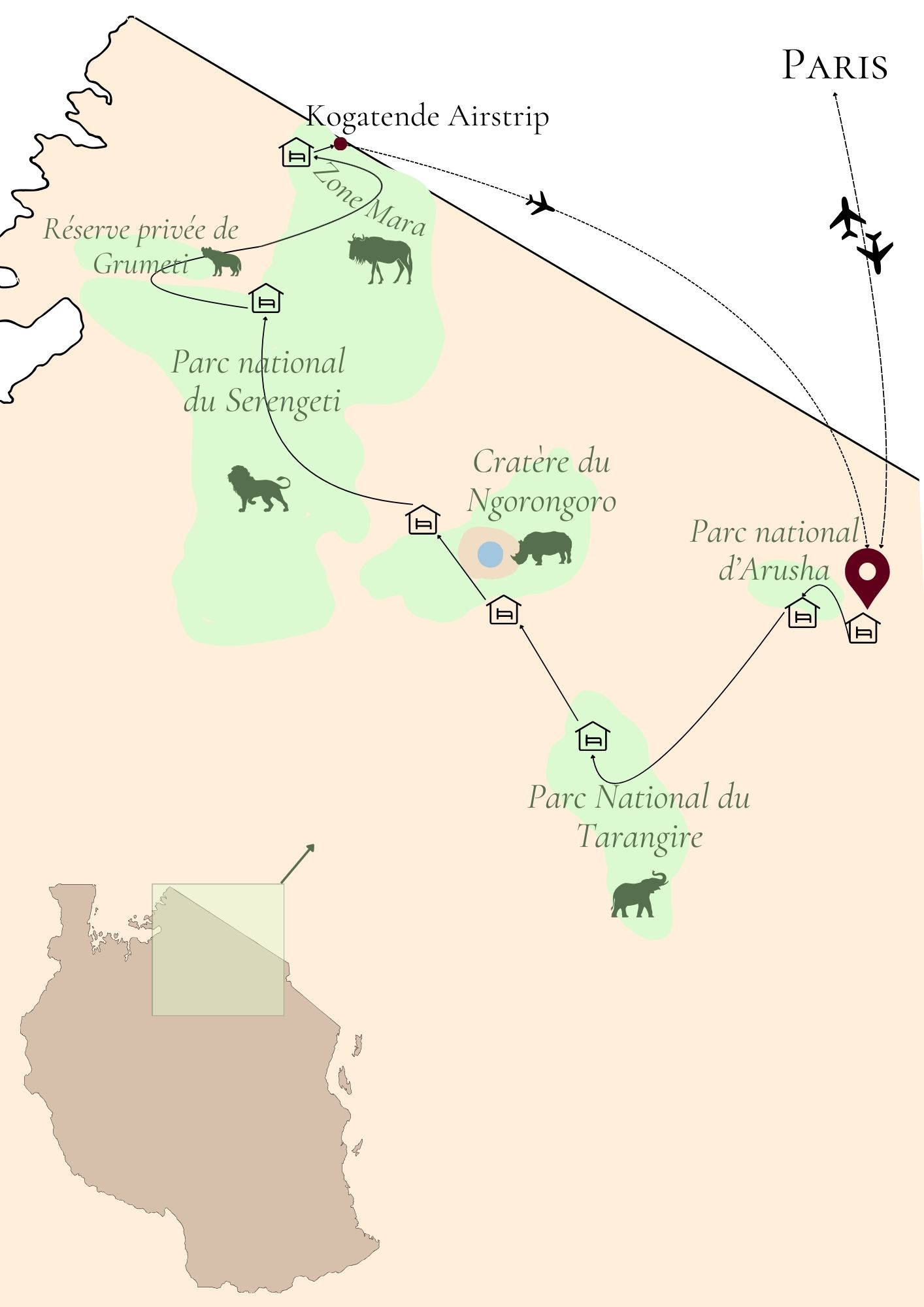 Vols directs Air France. Pour des visites à votre rythme tous nos groupes ne comprendront que 6 participants au maximum. Le transport terrestre en Land Cruiser privatisée du premier au dernier jour de safari avec chauffeur-guide francophone Allez à la découvertes des parcs incontournables du nord de la Tanzanie: Le Parc d'Arusha, le Parc National de Tarangire, le Parc du Serengeti mais découvrez également la zone Grumeti, le cratère du Ngorongoro ainsi que la zone Mara, au nord du Serengeti. Les chaleureuses visites des villages de Muala et de Mto Wa Mbu. Une soirée Maasai au coin du feu avec des chants et danses traditionnelles. Un safari de nuit et un safari pédestre dans la zone de Grumeti.