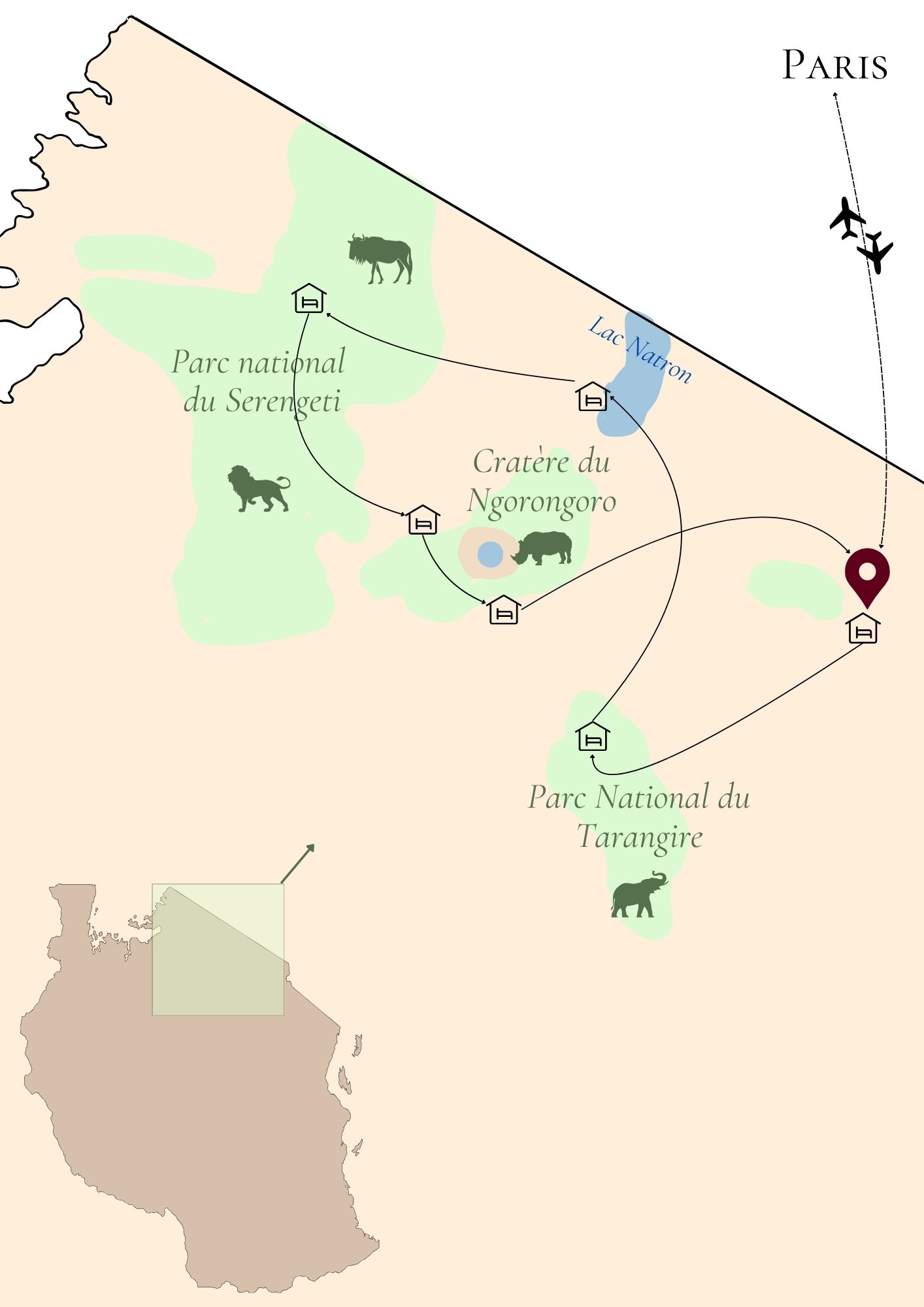 Vols directs Air France Pour des visites à votre rythme tous nos groupes ne comprendront que 6 participants au maximum. Le transport terrestre en Land Cruiser privatisée du premier au dernier jour de safari avec chauffeur-guide francophone Allez à la découvertes des parcs incontournables du nord de la Tanzanie: Le Parc National de Tarangire, le Parc du Serengeti mais découvrez également le Lac Natron et le cratère de Ngorongoro. Les chaleureuses visites du village de Mto Wa Mbu et de la Tribu Iraqw . Une soirée Maasai au coin du feu avec des chants et danses traditionnelles. Un déjeuner sur une aire privatisé au coeur de la Caldera au Ngorongoro. Découverte de la cascade Ngare Sero.